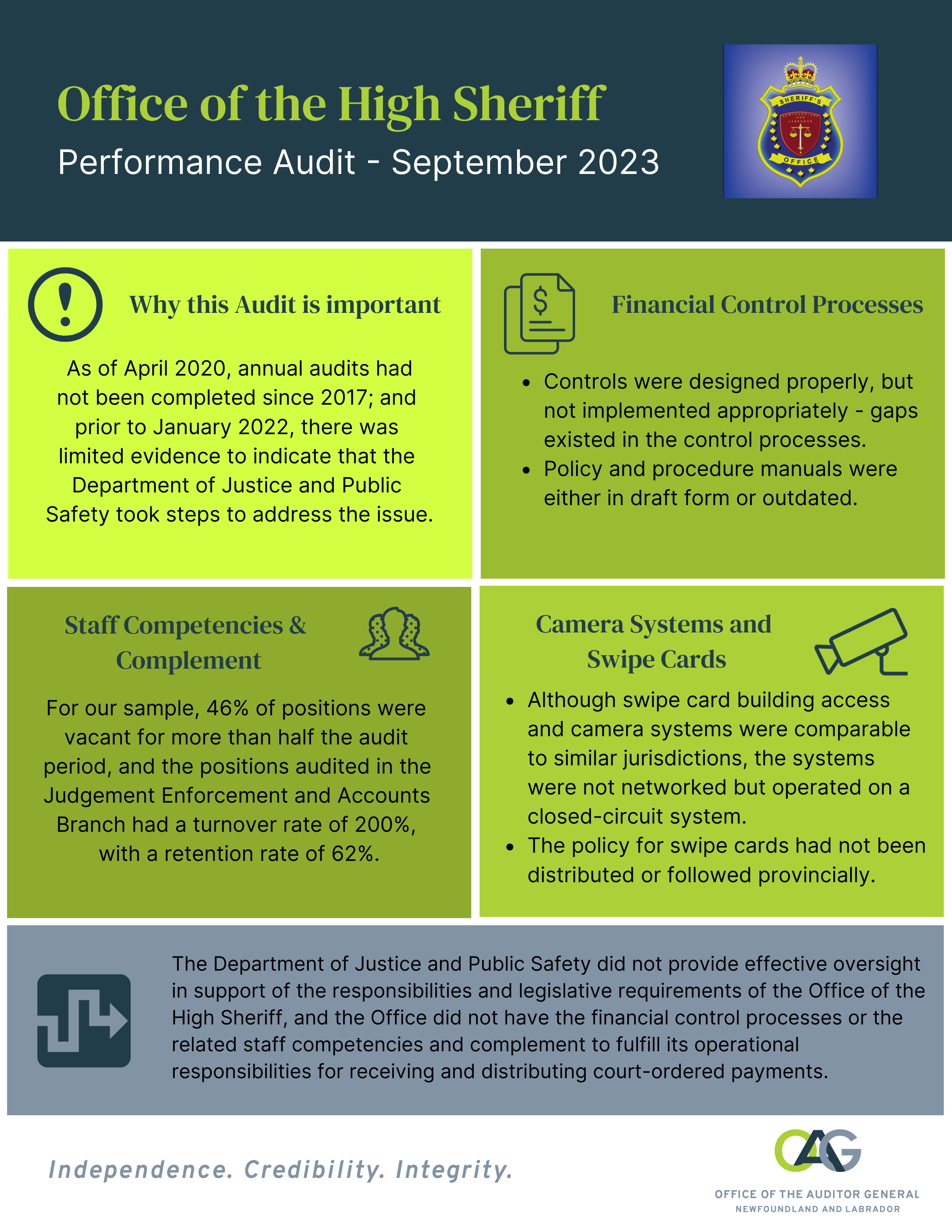 The Auditor General of Newfoundland and Labrador, Denise Hanrahan, today delivered a performance audit on the Office of the High Sheriff to the House of Assembly. The audit reports on findings and recommendations regarding the Office’s financial processes, staffing complement and competencies, security systems, and departmental oversight. The audit period was from April 2020 through December 2022.