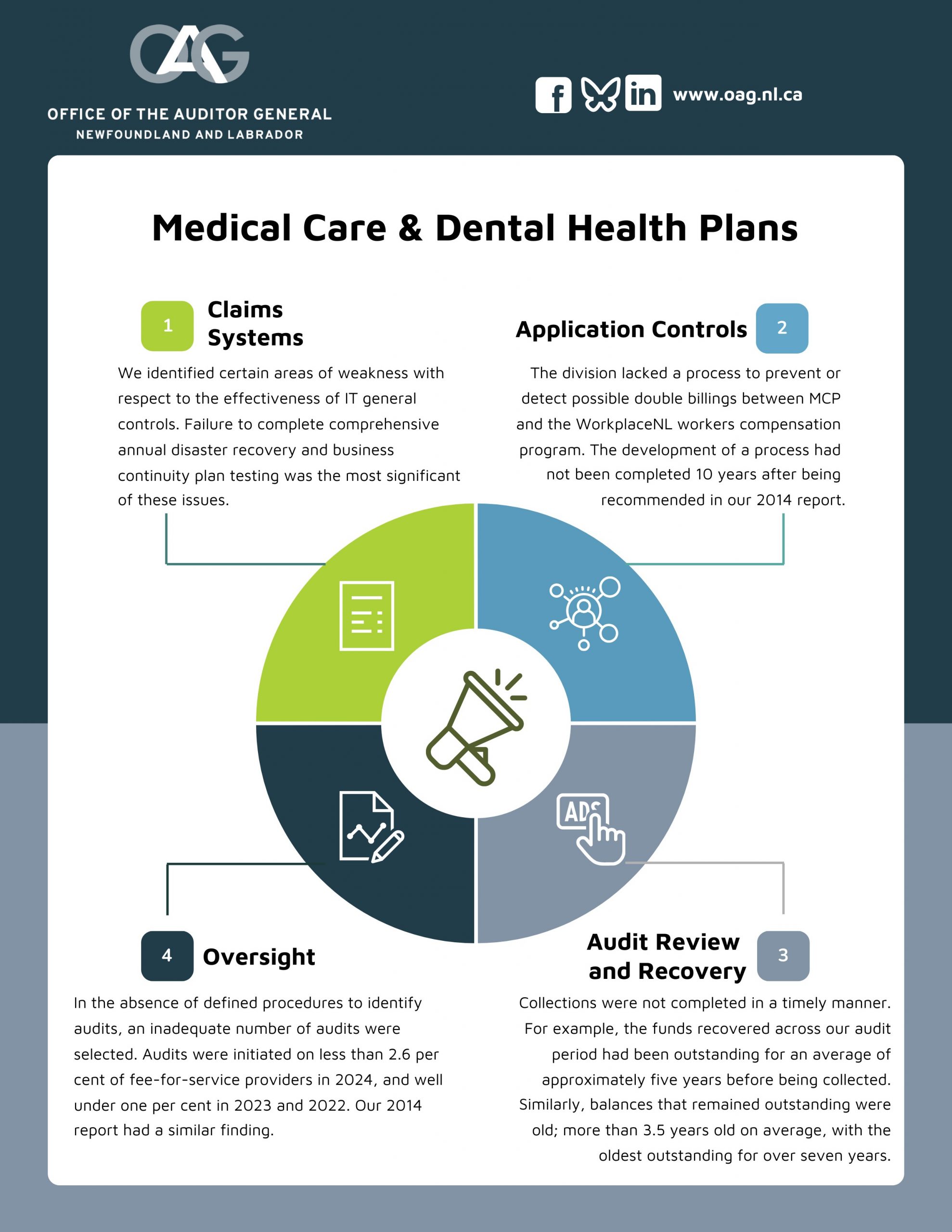 Auditor General of Newfoundland and Labrador, Denise Hanrahan, today delivered a performance audit report to the House of Assembly on the Medical Care Plan (MCP) and Dental Health Plan. Today’s report contains findings and recommendations, many similar to those identified in a 2014 audit of MCP, regarding the ineffective compliance function, information technology issues, and an overall lack of program oversight.