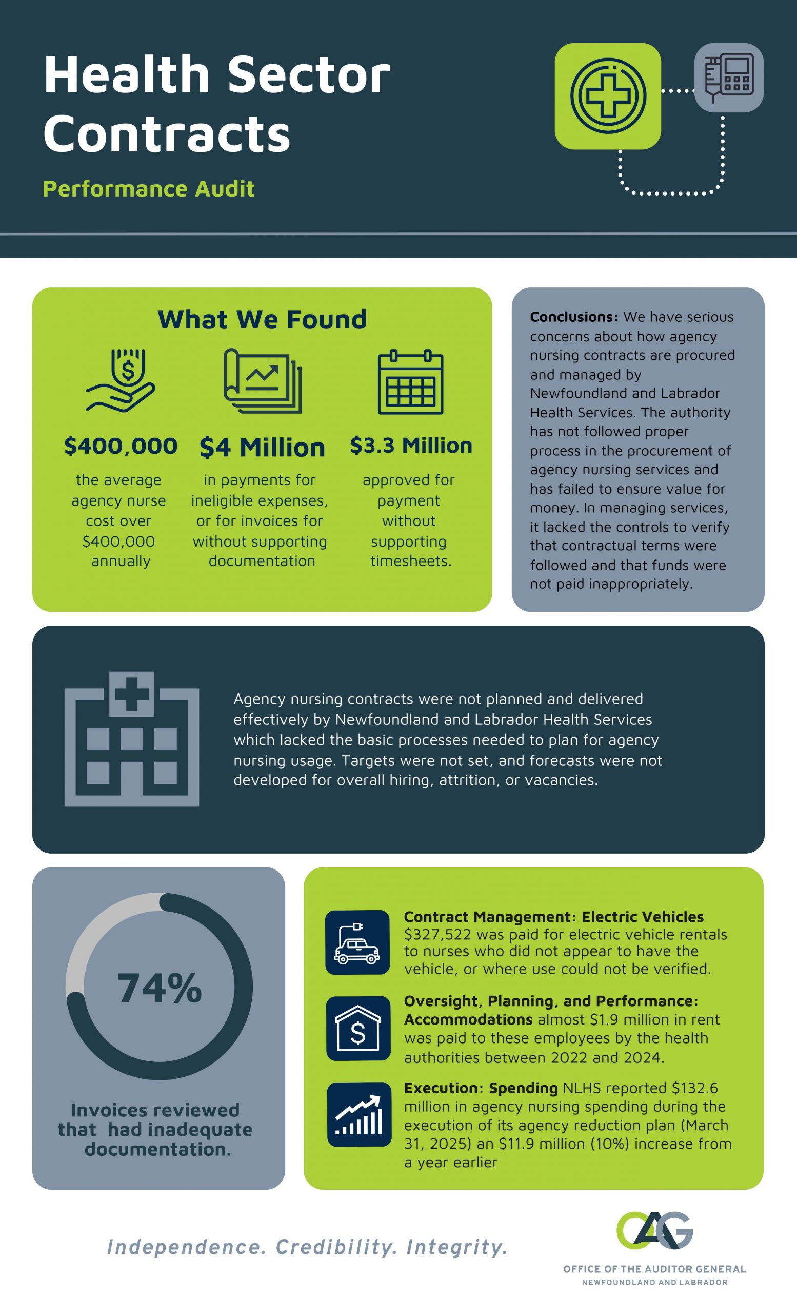 Auditor General of Newfoundland and Labrador, Denise Hanrahan, today delivered a performance audit report to the House of Assembly on health sector contracts phase one – nursing agency contracts. Today’s report contains findings and recommendations regarding Newfoundland and Labrador Health Service’s inability to effectively procure and manage agency nursing contracts worth over $240 million; how the health authority failed to ensure value for money; as well as details on how the authority failed to adequately plan for agency nursing usage.