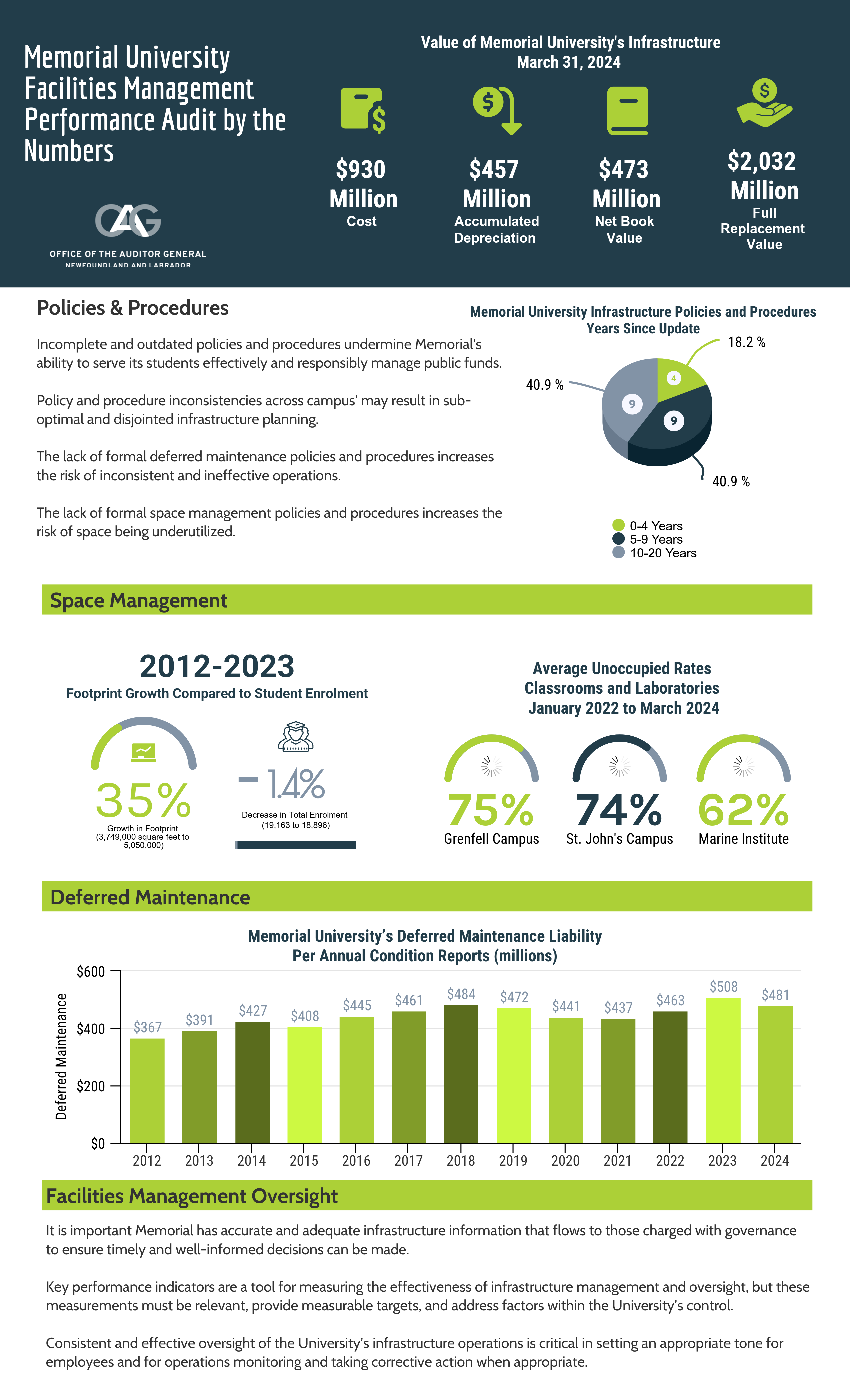Auditor General of Newfoundland and Labrador, Denise Hanrahan, today delivered a performance audit report to the House of Assembly on Memorial University’s facilities management. Today’s report contains findings and recommendations regarding Memorial’s inability to efficiently manage systematic infrastructure issues; findings on inadequate policies and procedures intended to guide deferred maintenance; as well as details on the mismanagement of funding specially designated to addresses current and future maintenance needs.