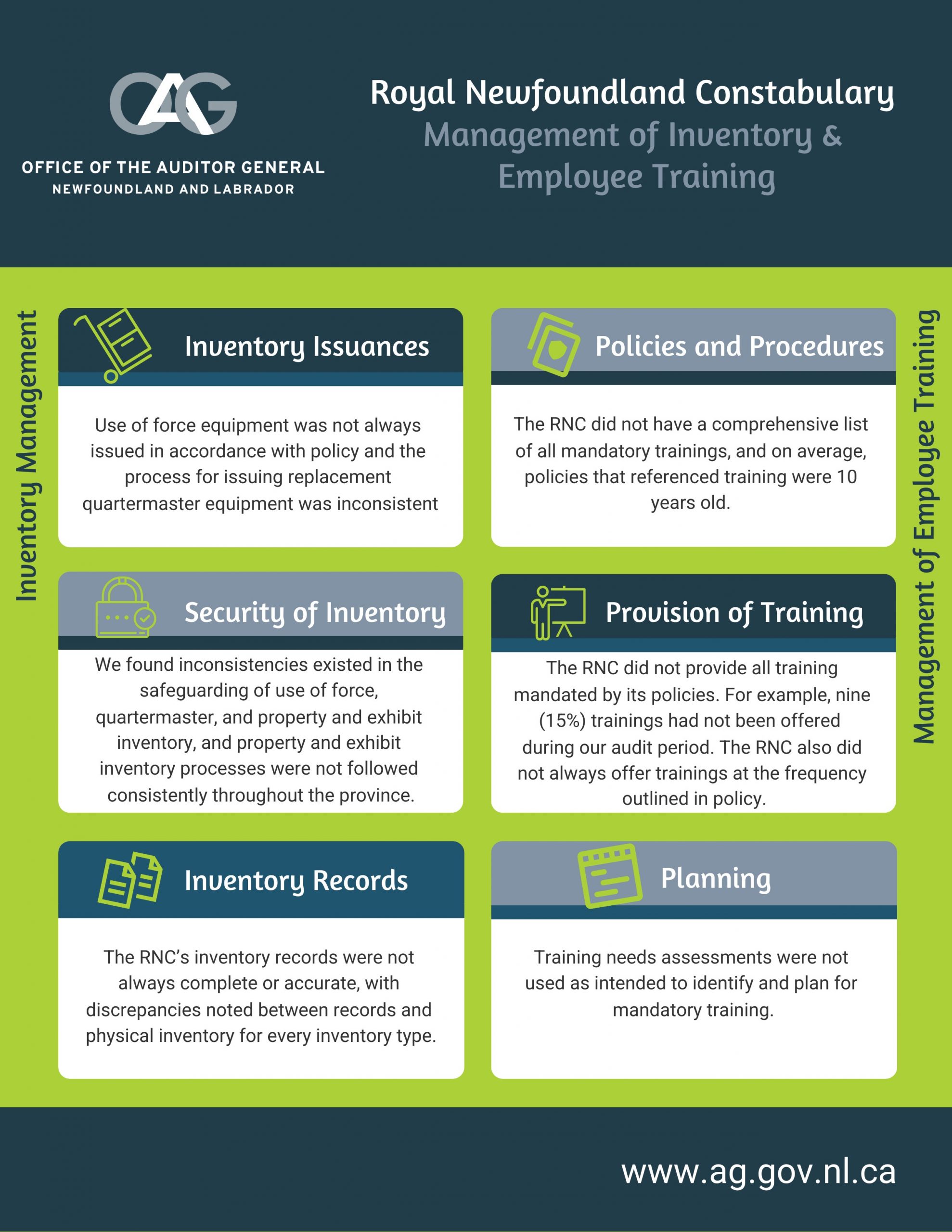 Auditor General of Newfoundland and Labrador, Denise Hanrahan, today delivered a performance audit report to the House of Assembly on the Royal Newfoundland Constabulary’s management of inventory and employee training. The report contains findings and recommendations regarding the Constabulary’s failure to effectively manage inventories and employee training. Consistent failure to comply with its own inventory and training policies over the course of the audit was underscored by inconsistent, informal, outdated, and incomplete policies and procedures.