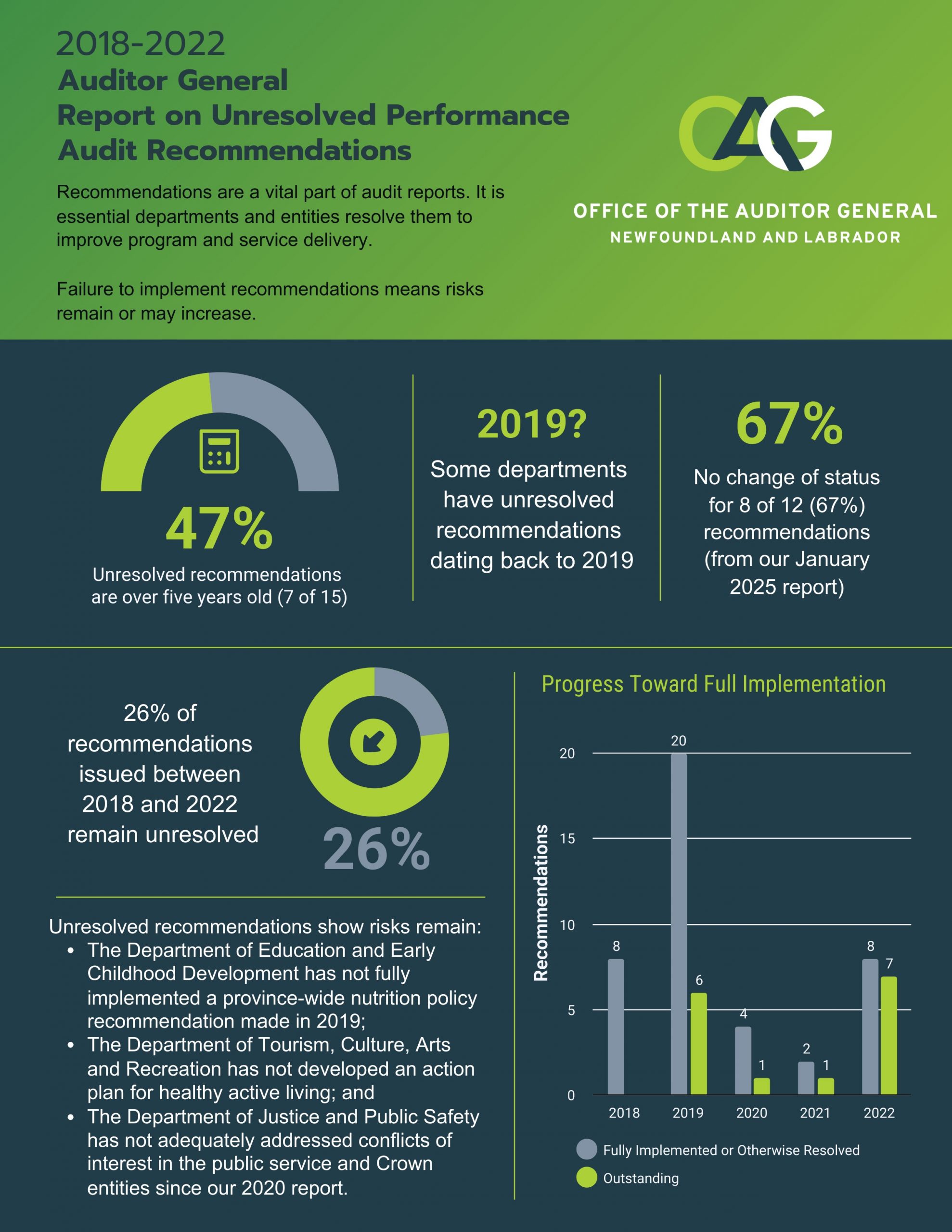“Recommendations are a vital component of audit reports, and it is essential departments and entities fully implement or otherwise resolve them,” added Auditor General Hanrahan. “The number of unresolved recommendations – after seven years – highlights ongoing gaps that require attention. Of particular concern are entities that continue to have low implementation rates years after the recommendations were issued, such as those from the 2019 audit into provincial wellness priorities at the Department of Tourism, Culture, Arts and Recreation and the 2020 recommendation to the Department of Justice regarding conflict of interest.”